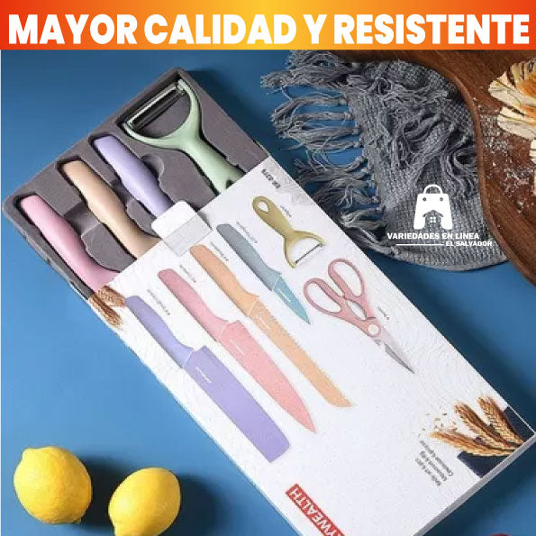 Set de 4 Cuchillos Multicolor en Acero Inoxidable + Tijera de cocina y Pelador